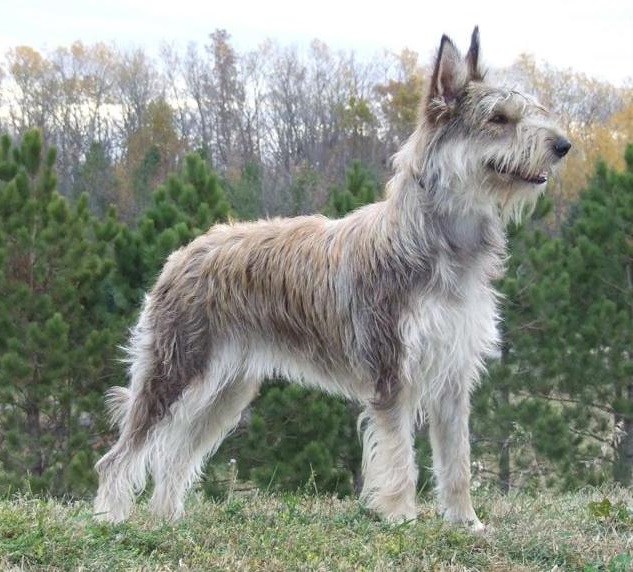 The Berger Picard is a medium-sized, well-muscled dog, slightly longer than tall with a tousled yet elegant appearance. Their ears are naturally erect, high-set and quite wide at the base. Their eyebrows are thick, but do not shield their dark frank eyes. Yes, they really do smile! Their natural tail normally reaches to the hock and is carried with a slight J-curve at the tip.
